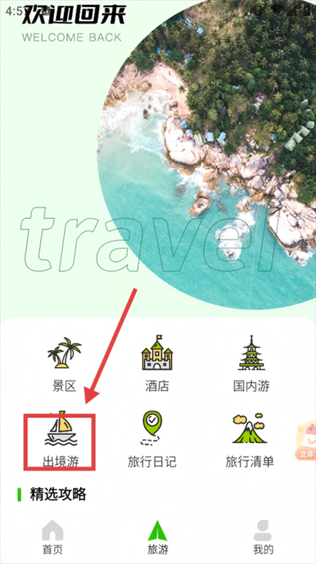 2、在旅游页面,点击【出境游】,进入出境游攻略列表页面。