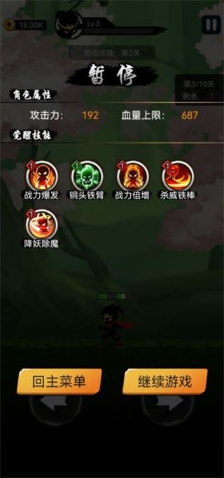 3、在右上角,玩家可以查看角色的属性以及觉醒技能,同时也可以返回主菜单。